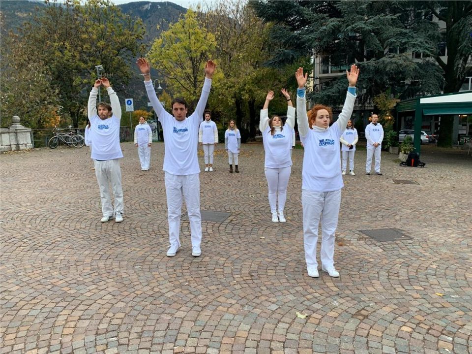 Un gruppo di ragazzi vestiti di bianco con una maglietta con la scritta RESPIRIAMO, lunedì 11 novembre, ha eseguito in tre piazze cittadine a Bolzano una coreografia armonica ed equilibrata, che simulava il movimento della respirazione.