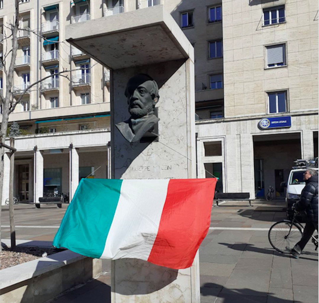Nel 159º anniversario dell’Unità d’Italia la sezione bolzanina di CasaPound ha avvolto nel tricolore nazionale il busto di Giuseppe Mazzini nell’omonima piazza “nel rispetto di tutte le norme previste nel decreto sicurezza per l’emergenza Coronavirus”, tengono a precisare.