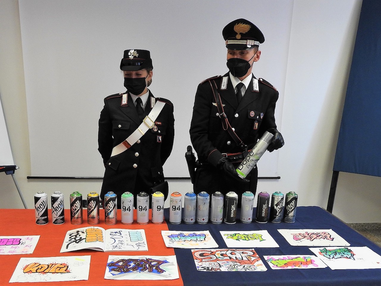 I carabinieri nella perquisizione hanno trovato ben diciotto bombolette spray di vari colori nonché diversi “bozzetti” su carta.