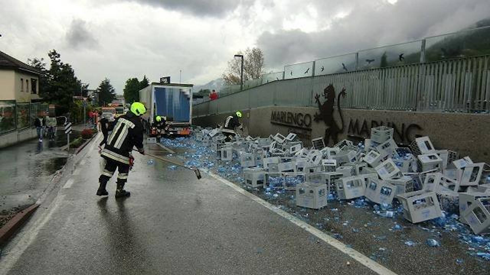 Diversi disagi alla viabilità sono stati causati questa mattina (26 aprile) per un camion proveniente da Merano che ha perso il suo carico di bevande sulla strada statale delle Palade, poco dopo il ponte di Marlengo.