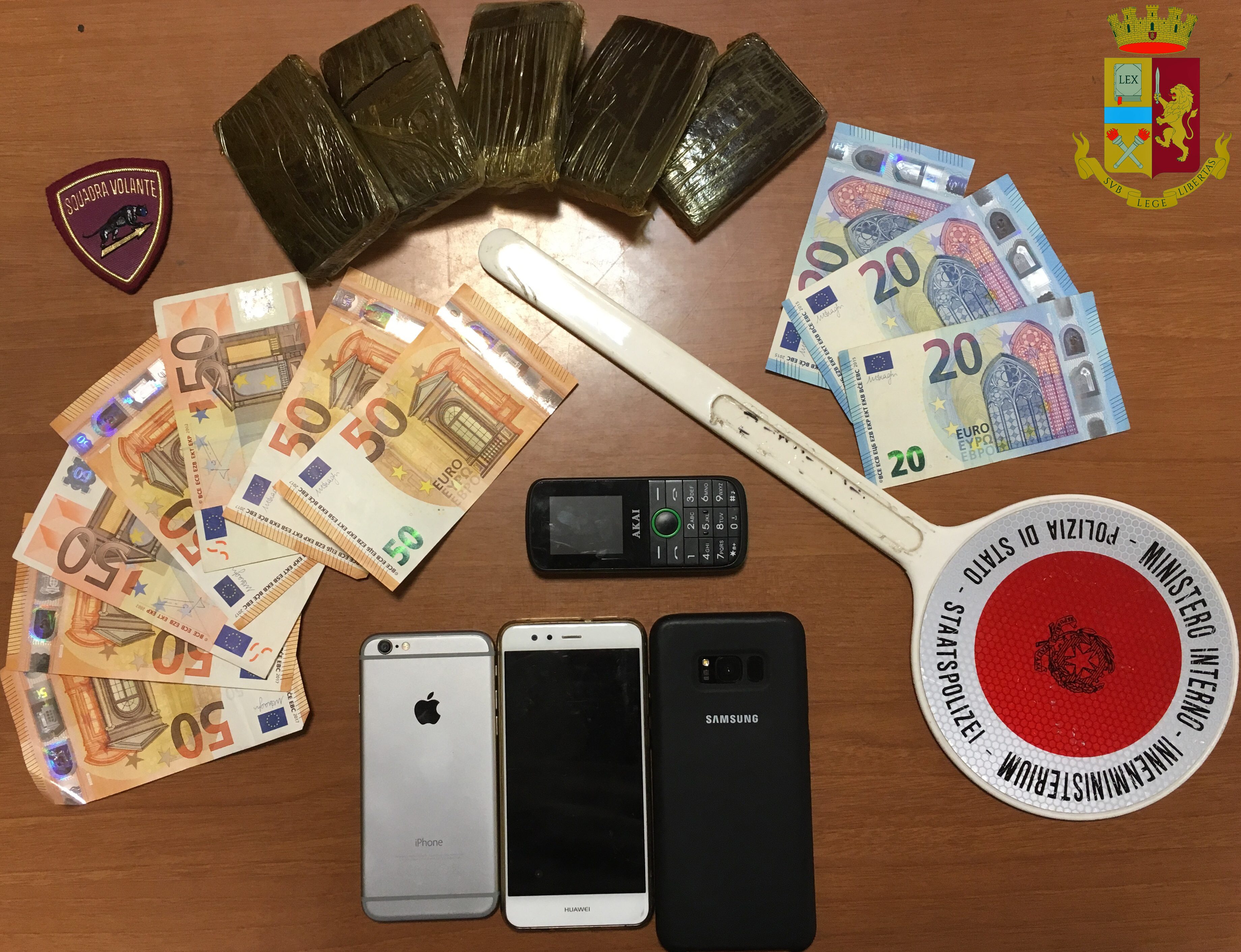 Gli agenti hanno quindi bloccato i sospetti, rinvenendo cinque panetti di Hashish, per un peso di quasi 500 grammi, e 410 Euro in contanti di vario taglio.