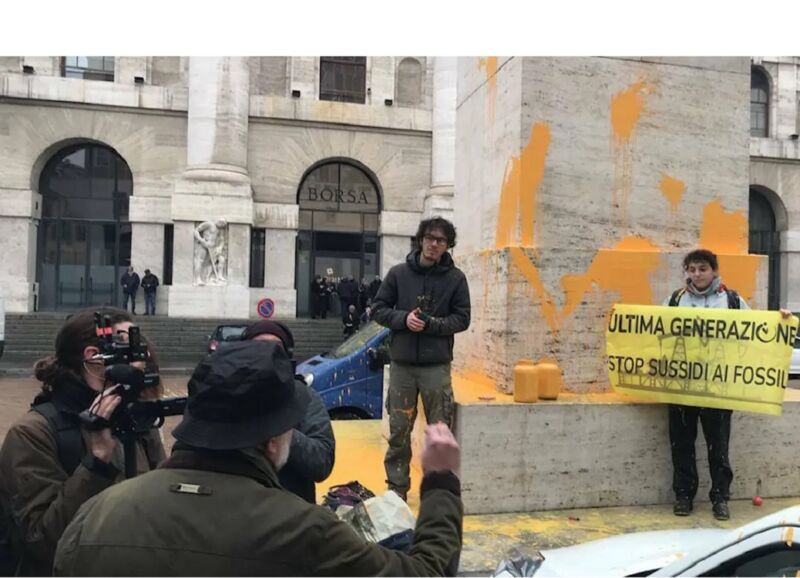 Lo stesso movimento attraverso una nota avrebbe spiegato così i motivi del gesto: “L’azione non violenta coinvolge la base di un monumento che simboleggia una provocazione e un monito contro lo strapotere finanziario: la scultura rappresenta una mano atteggiata al saluto romano, ‘mutilata’ di tutte le sue dita, fuorché’ il medio, posizionata in Piazza degli Affari, di fronte al palazzo della Borsa”. “Ultima Generazione vuole richiamare l’attenzione su come le scelte dei decisori politici e finanziari siano ancora lontane da un’ottica di sostenibilità e da una giusta visione di futuro”: aggiungono.