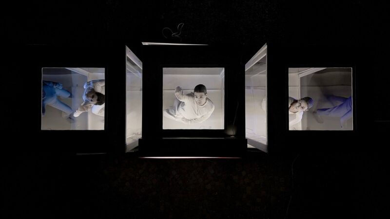 In piazza Matteotti verrà allestita un’installazione composta da tre grandi prismi cuboidi di cristallo trasparente. Tre luoghi chiusi in cui si muoveranno i danzatori. All’esterno un musicista alla loop-station comporrà sul momento la musica.