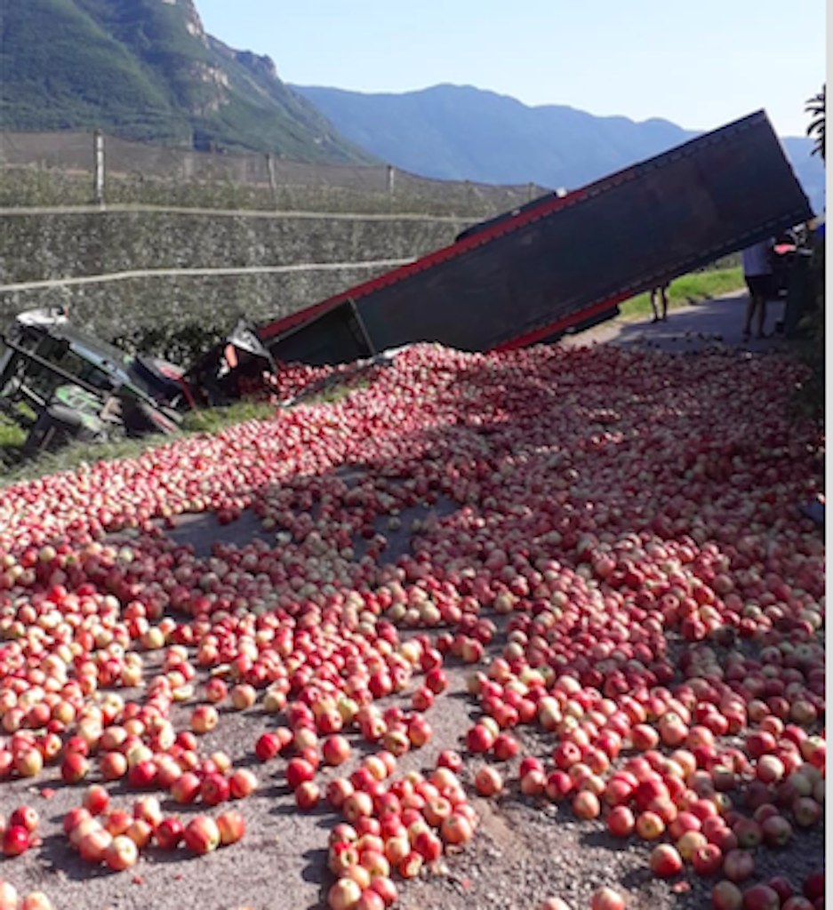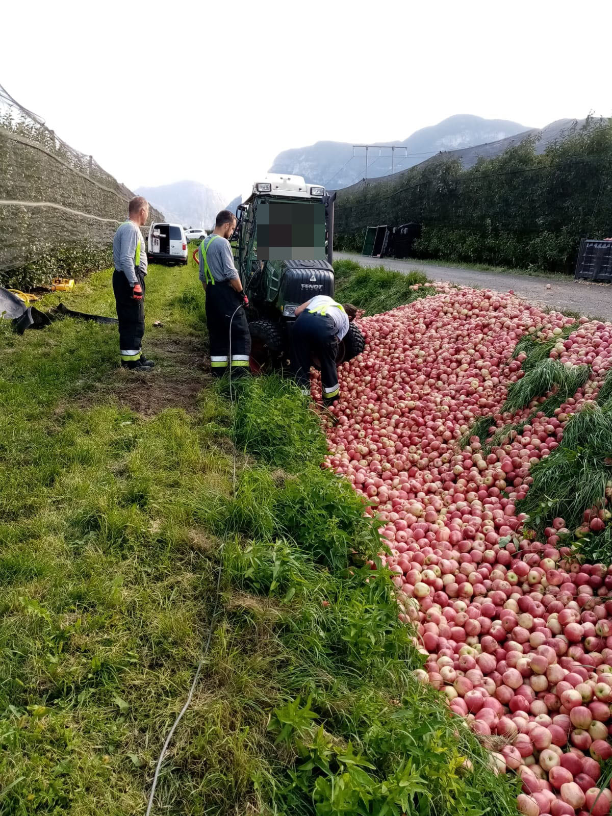 Incidente con il trattore a Termeno: ribaltato il carico di mele