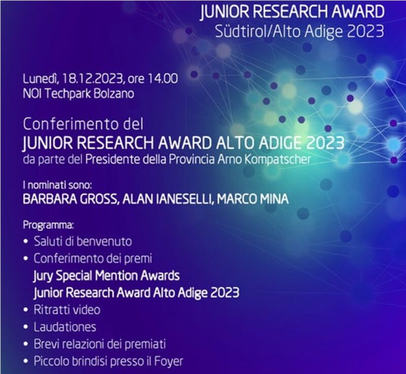 Ogni due anni la Provincia autonoma di Bolzano premia con il “Junior Research Award Südtirol/Alto Adige” gli scienziati che sono all’inizio della loro carriera (ricercatori junior) ma che si sono già affermati nel loro campo di ricerca. Oltre al Junior Research Award, dotato di 10.000 euro, la Provincia assegna anche due premi di menzione speciale della giuria. Quest’anno sono stati nominati vincitori i tre ricercatori Barbara Gross, Alan Ianeselli e Marco Mina. Il lavoro dei tre giovani ricercatori lascia presagire per loro una promettente carriera scientifica.