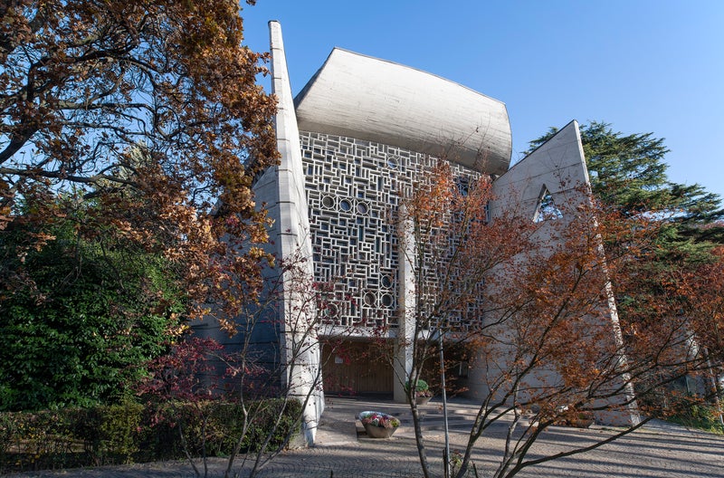 La Chiesa di San Pio X – La struttura in cemento armato, irregolare e a navata unica, della chiesa è caratterizzata da forme arrotondate in calcestruzzo e presenta su entrambi i lati longitudinali due elementi tondi aggettanti che formano all’interno altrettante nicchie. La superficie in calcestruzzo delle pareti esterne è segnata da strisce trasversali e sormontata da elementi di copertura a forma di vele. Lo spazio interno è compreso entro due alte pareti ricurve che si aprono arditamente ad ala verso l’esterno e da un’ampia parete di vetri colorati racchiusi entro una cornice minuta a formare una sorta di mosaico a nido d’ape. La zona d’ingresso, arretrata, si trova sotto una struttura cruciforme in calcestruzzo. Le due porte d’ingresso racchiudono all’interno una nicchia con una cappella illuminata a giorno. All’interno della chiesa, alla quale le superfici concave in calcestruzzo conferiscono un carattere di ventre mistico e contemplativo, l’architetto impiega le ombre, la luce e i colori del fronte vetrato come elementi di una composizione. Il pozzo di luce centrale, collocato al di sopra dell’ambito elevato dell’altare, immerge questo e la navata laterale in una luce naturale diffusa, incorniciata da una sottile catena di piccole aperture triangolari ricavate nelle pareti laterali.