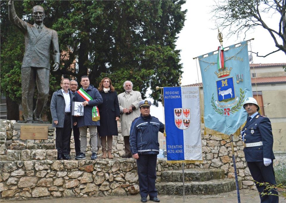 La città di Matera, Capitale europea della Cultura 2019, è particolarmente legata ad Alcide De Gasperi e con questa iniziativa la Regione Trentino-Alto Adige/Südtirol – proposta dall’assessore Claudio Cia – ha voluto recuperare il ricordo per l’impegno di De Gasperi nel miglioramento delle condizioni abitative e umane degli abitanti dei Sassi, e in particolare, come riportato nell’iscrizione “per rinnovare il gesto di gratitudine di quanti intesero ricordare la sua dedizione con la collocazione del monumento qui posto nel 1971”.