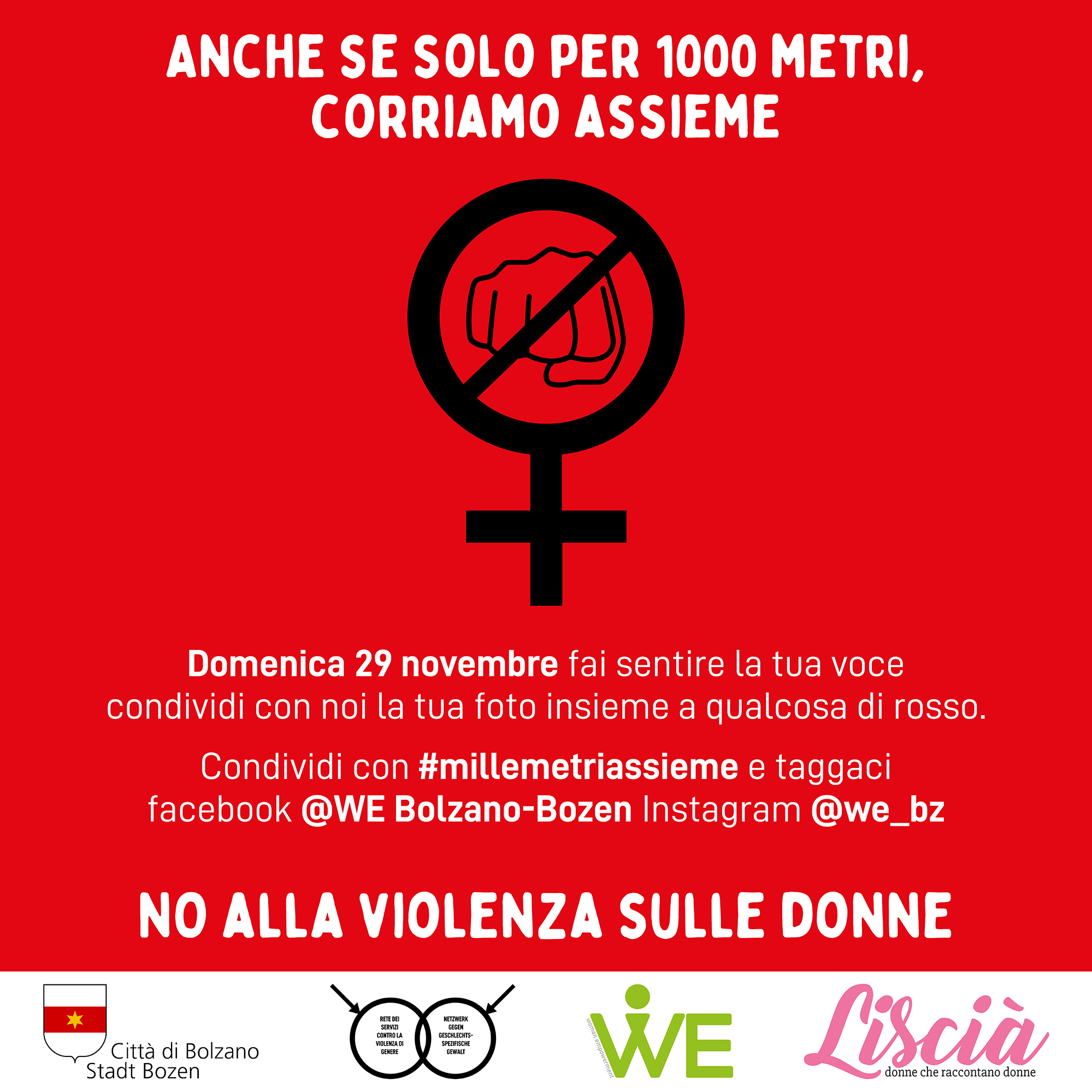 Grazie alla rete di WE-women empowerment, in particolare alle operatrici dei progetti “Liscià. Donne che raccontano donne” e “Artemisia” e al sostegno del Comune di Bolzano, la tradizionale Corsa antiviolenza sui prati del Talvera da fisica diventa digitale: attraverso l’hasthag #millemetriassieme è stato lanciato un appello per invitare la cittadinanza ad esporsi, a solidarizzare ma anche opporsi alla violenza di genere, nello specifico alla violenza sulle donne.