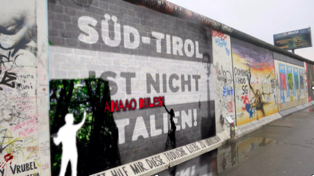 In esso è raffigurato un (altro) muro di mattoni con una scritta semicancellata <<SÜDTIROL IST NICHT ITALIEN!>>, letteralmente il Sudtirolo non è Italia, dove alla sua destra campeggia un’immagine sorridente del presidente della provincia altoatesina Kompatscher, alla sinistra una figura maschile che copre la scritta con l’immagine di un bosco a rappresentare la libertà oltre i muri ed infine, proprio al centro, una figura femminile intenta a scrivere <<ANAAO RULES!>>.