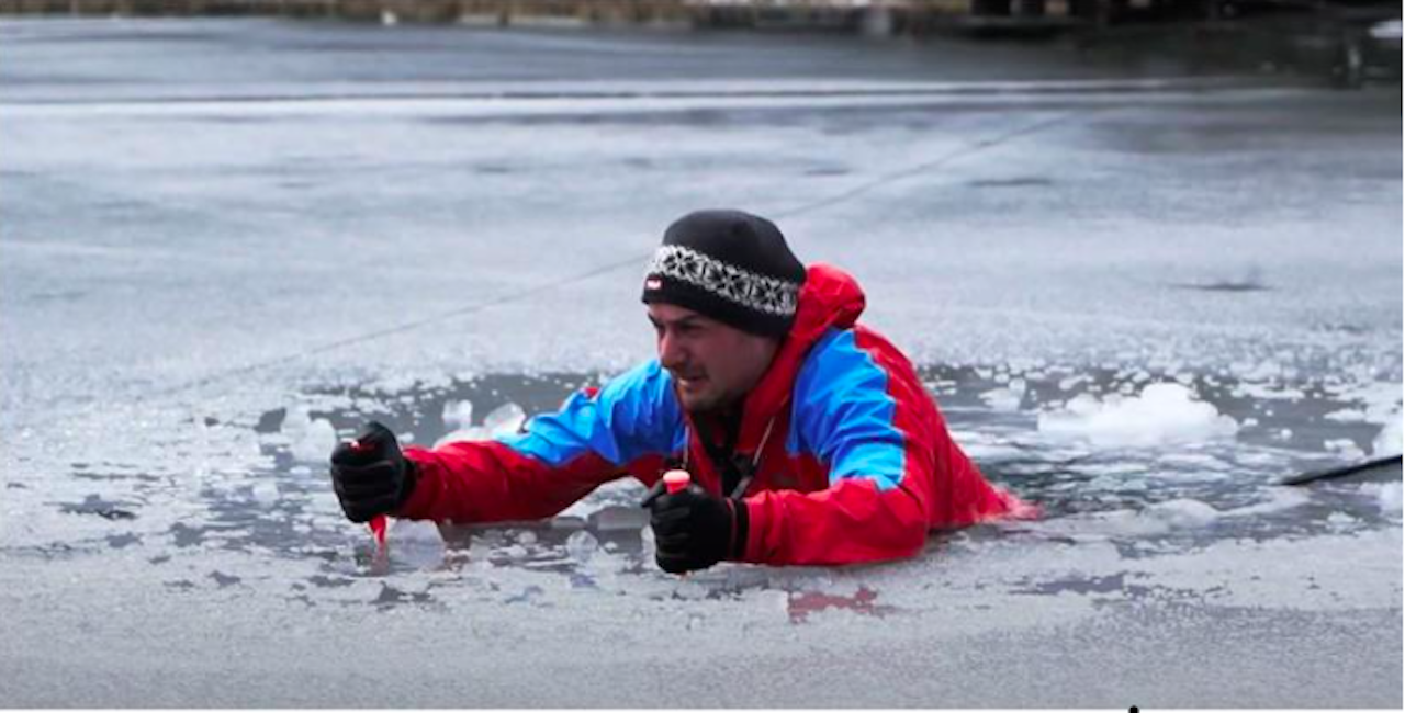 Mediante l’utilizzo dei “chiodi da ghiaccio” ci si può tirare fuori dall’acqua rapidamente. Se ne consiglia l’utilizzo come mezzo di protezione personale da portare sempre con se quando si accede a superfici ghiacciate.