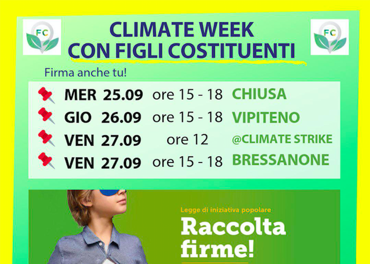 Prosegue la raccolta firme per inserire in Costituzione lo sviluppo sostenibile, la difesa dell’ambiente e l’equità fra generazioni. Sarà possibile firmare per la legge di iniziativa popolare denominata “Figli Costituenti” fino all’11 ottobre in ogni comune altoatesino.