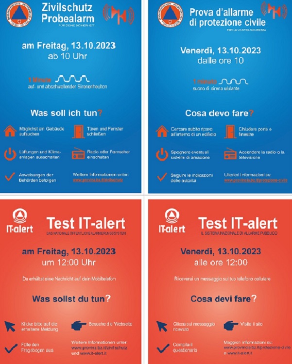 Come già avvenuto in Trentino e in tante altre Regioni, il test della Protezione Civile arriva anche in Alto Adige il prossimo 13 ottobre alle 10 del mattino.
