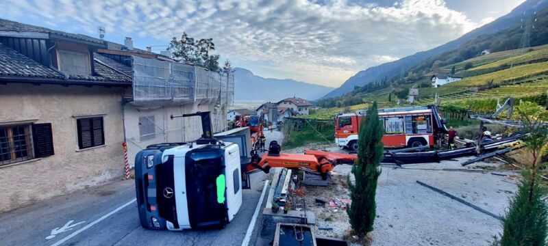 Termeno, autogru si ribalta: scatta il doppio intervento dei vigili del fuoco