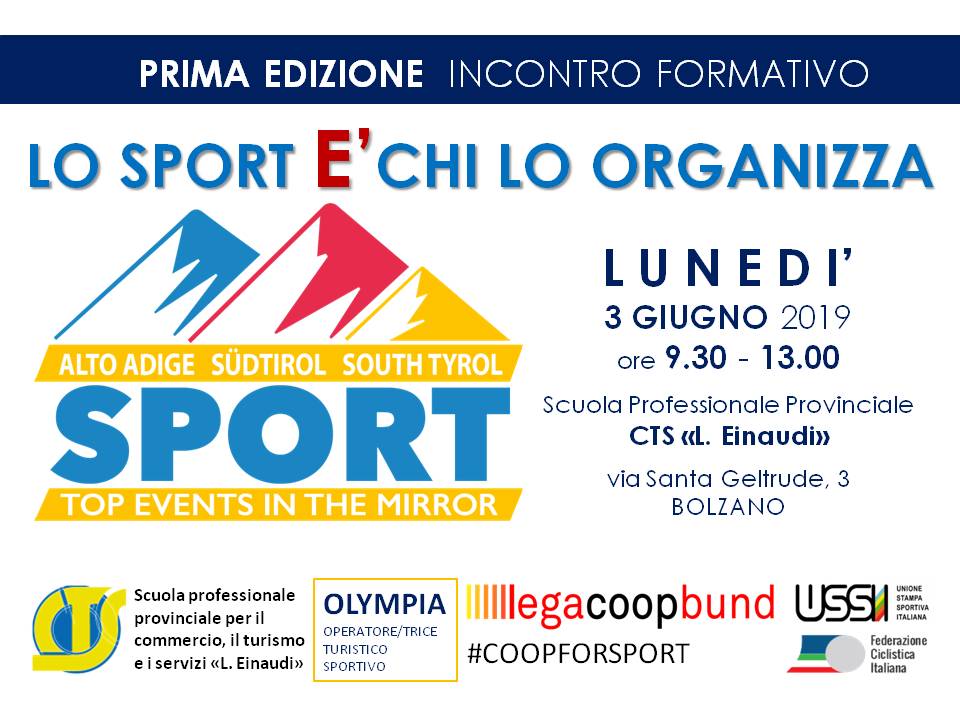 La Scuola Professionale per il commercio, il turismo e i servizi CTS “L. Einaudi” – Olympia operatore/trice turistico sportivo e Legacoopbund, associazione di rappresentanza delle società cooperative attraverso il suo progetto #Coopforsport, insieme a USSI Unione Stampa Sportiva Italiane e FCI Federazione Ciclistica Italiana Comitato provinciale Alto Adige Südtirol organizzano per lunedi’ 3 giugno 2019, dalle ore 9.30 alle ore 13.00, presso L’Auditorium “L. Battisti” della Scuola Professionale di via Santa Geltrude 3 a Bolzano la prima edizione di una serie di incontri, aperti al pubblico e al territorio, intitolati: “Top events in the mirror: lo sport E’ chi lo organizza” con protagonisti gli organizzatori di grandi eventi e responsabili di realtà sportive professionali. Gli organizzatori dei grandi eventi sportivi illustrano eccellenze che, oltre al valore agonistico, costituiscono una fonte preziosa per il settore turistico e incidono sull’economia della provincia di Bolzano, promuovono il territorio, la natura, lo stile di vita sano e attivo.