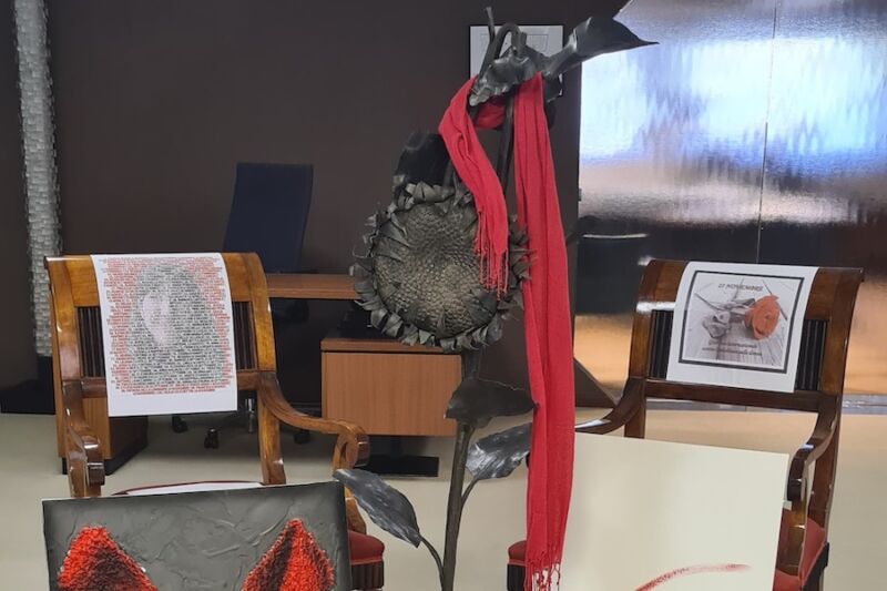 Al centro dell’installazione si trova “Il girasole spezzato”, un’opera d’arte in ferro battuto dell’artista Luciano Zanon. L’opera è coperta da un drappo rosso, una rappresentazione visiva del bollettino di guerra delle donne uccise nel 2023.