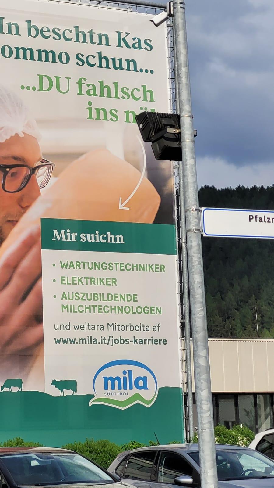 Sono comparsi da qualche settimana nei pressi di Brunico i nuovi pannelli pubblicitari della Mila, azienda di prodotti derivati dal latte, pannelli contenenti un’offerta di lavoro scritta solamente in dialetto locale tedesco.