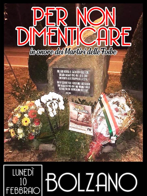 Lunedì 10 febbraio, giornata del ricordo dedicata ai martiri delle Foibe, un mazzo di fiori verrà deposto ai piedi del monumento che li onora lungo le passeggiate del Talvera dai rappresentanti bolzanini di Forza Nuova.