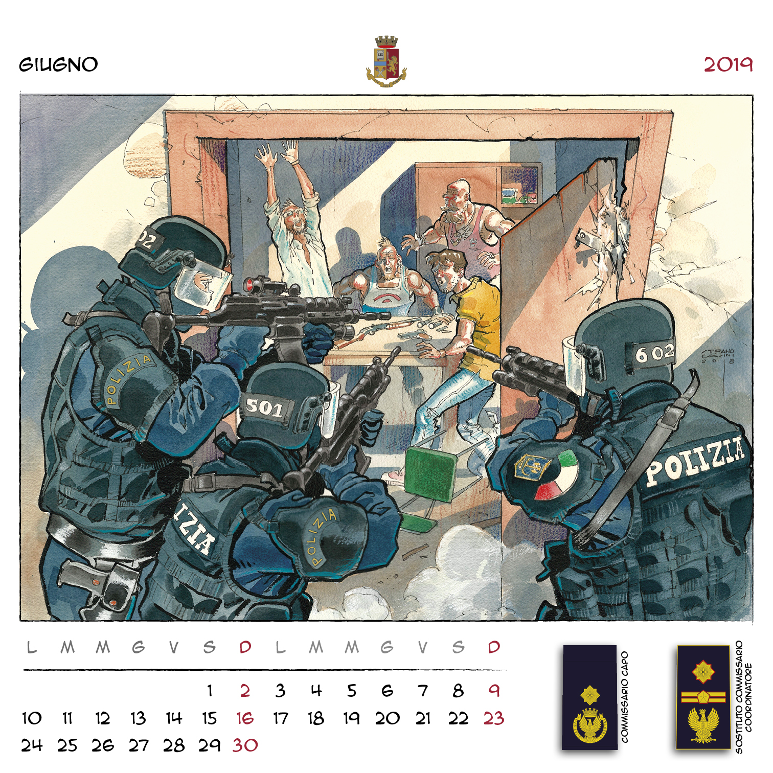 Dodici illustratori italiani, dunque, che hanno lavorato insieme a noi per immaginare, ciascuno con il proprio peculiare tratto stilistico, dodici momenti dell’attività di donne e uomini della Polizia di Stato, ognuno con un preciso riferimento a un nuovo distintivo di qualifica.