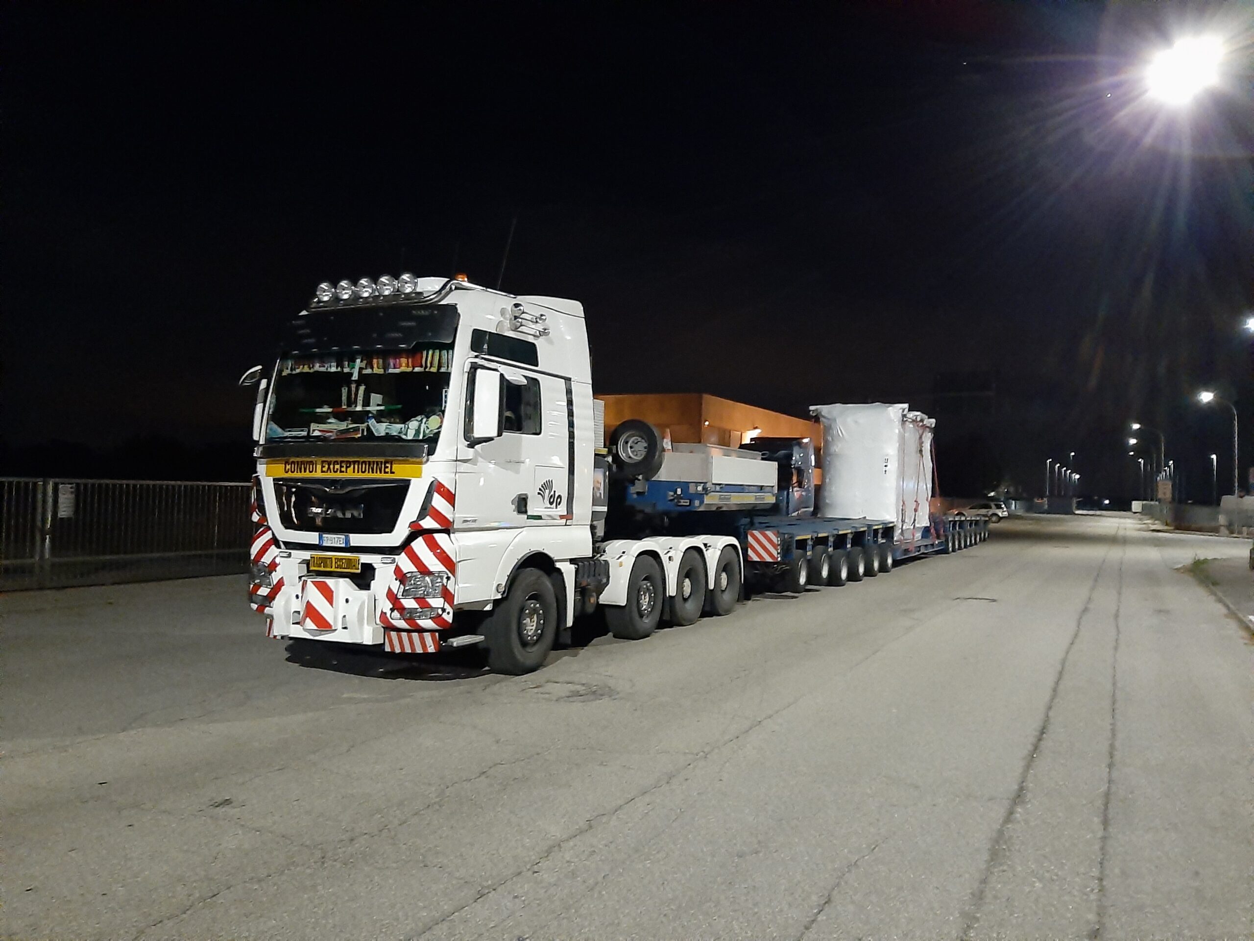 Per spostare in sicurezza un carico così notevole, il peso è stato scaricato su 18 assi dislocati lungo i 40 metri dell’autocarro utilizzato.