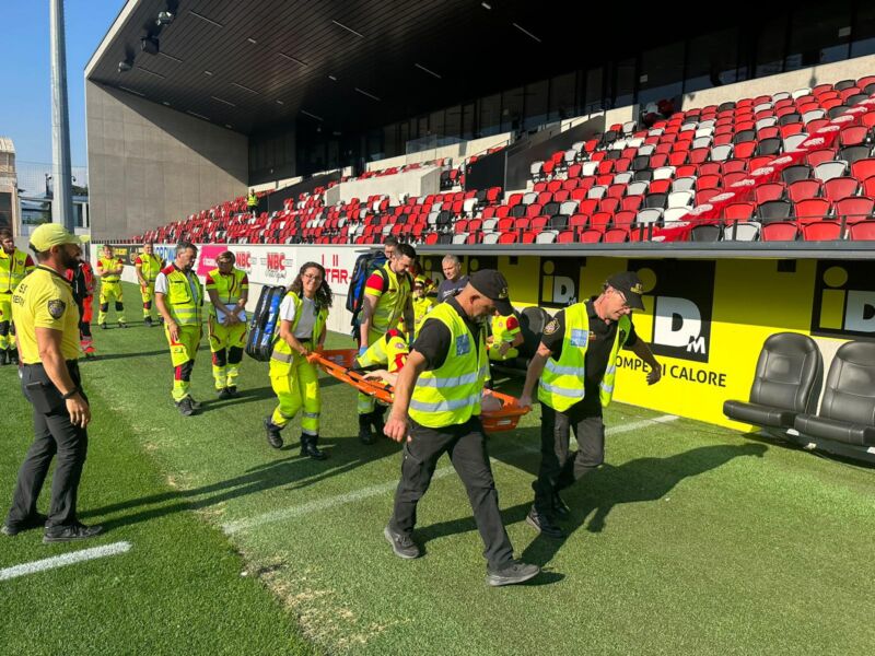 L’esercitazione-simulazione si è svolta con seguendo alcune precise modalità-criticità: dall’evacuazione di un infortunato dalle tribune- seduto, alla crisi di panico all’ingresso e all’uscita (punti di restringimento del percorso), dalla presenza di fan/ultrà sul muretto o ingresso in campo, alla rissa/crisi di panico nei punti di ristoro al primo piano, all’allestimento di una tenda maxi per gestire lì emergenza.