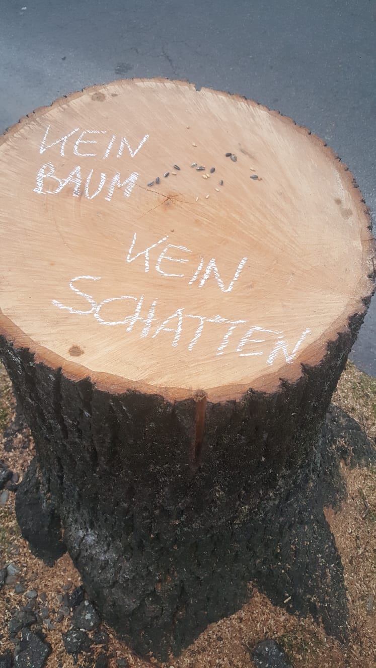 Altri, hanno anche lasciato delle scritte in bianco sui monconi dei fusti. Parole di tristezza in italiano e in tedesco: “No more birds home“, “Kein Baum, kein Schatten“.