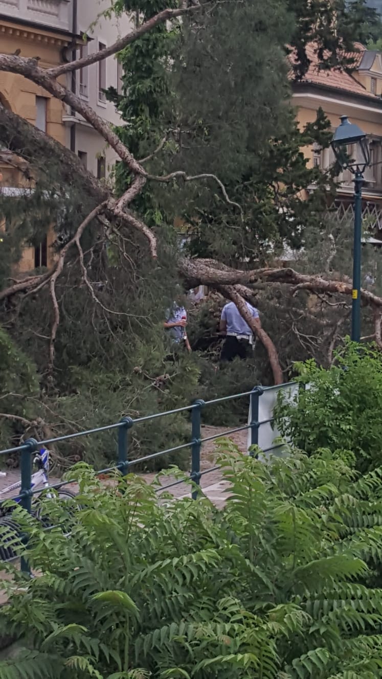 Sono stati dichiarati fuori pericolo la turista tedesca e il suo bambino di quasi tre anni che ieri (11 giugno) sono stati colpiti da un albero abbattuto da una tromba d’aria a Merano.