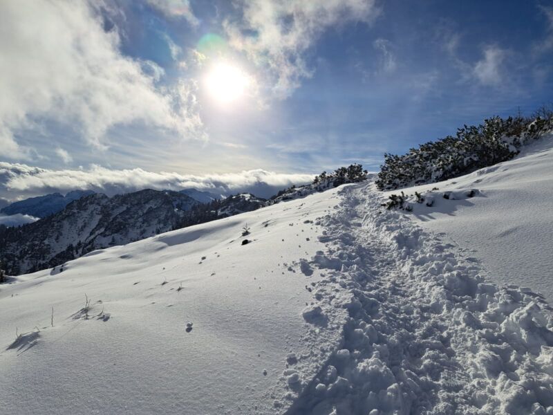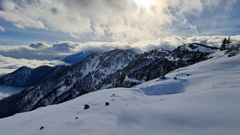Una volta raggiunta la vetta del Monte Maggio, il panorama ripaga ogni sforzo: una vista a 360 gradi che spazia dalle cime innevate alle vallate sottostanti, fino ai piccoli villaggi alpini incastonati tra i monti. Durante la Grande Guerra, questa posizione rappresentava un presidio strategico di primaria importanza, un luogo chiave per il controllo del territorio. Ma ora, ciò che rimane è un paesaggio che invita alla contemplazione e alla riflessione.