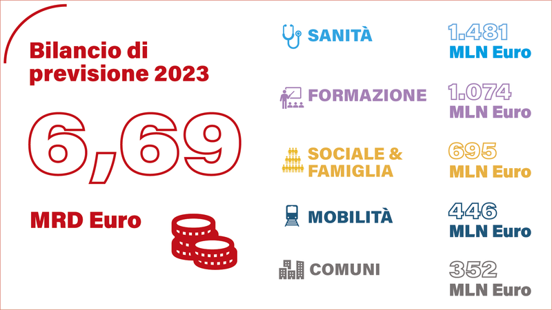 Sul fronte delle spese, nel bilancio di previsione 2023 l’area di intervento sulla tutela della salute rimane anche quest’anno al primo posto con 1,48 miliardi di euro assegnati. Seguono la scuola e il diritto all’istruzione con 1,07 miliardi di euro e le politiche sociali e famiglia (695 milioni).