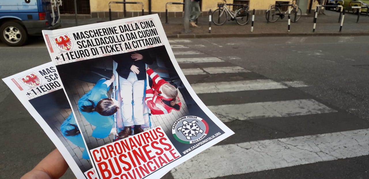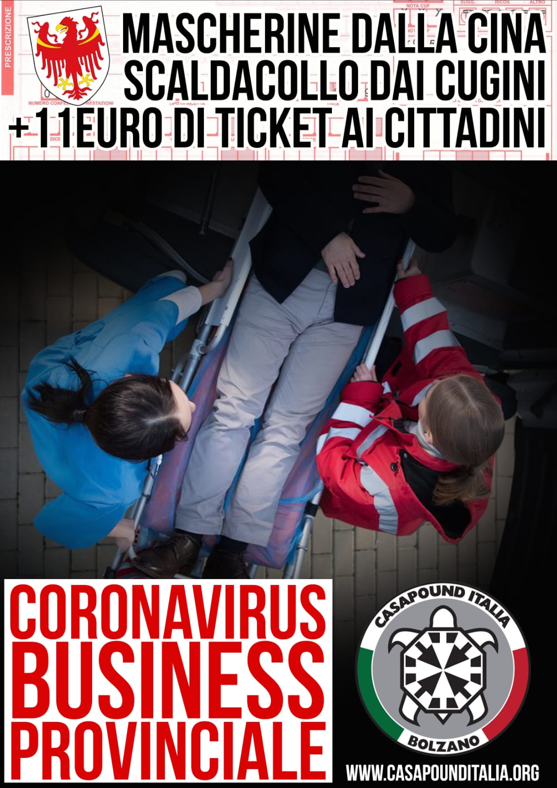 “Mascherine dalla Cina, scaldacollo dai cugini, + 11euro di ticket ai cittadini” questo il semplice testo contornato dallo stemma della Provincia di Bolzano e impresso sui volantini di Cpi con un immagine forte, un paziente imbarellato, e lo slogan shock a caratteri cubitali “Coronavirus business provinciale“.