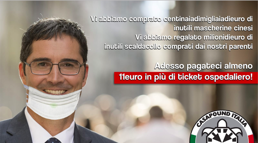 “Mascherine dalla Cina, scaldacollo dai cugini, + 11euro di ticket ai cittadini” questo il semplice testo contornato dallo stemma della Provincia di Bolzano e impresso sui volantini di Cpi con un immagine forte, un paziente imbarellato, e lo slogan shock a caratteri cubitali “Coronavirus business provinciale“.