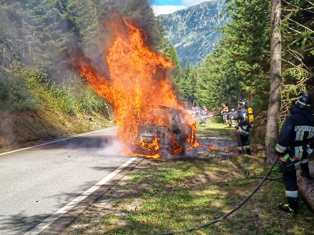 Auto completamente avvolta dalle fiamme sulla strada del Passo Pennes: decisivo l’intervento dei Vigili del Fuoco