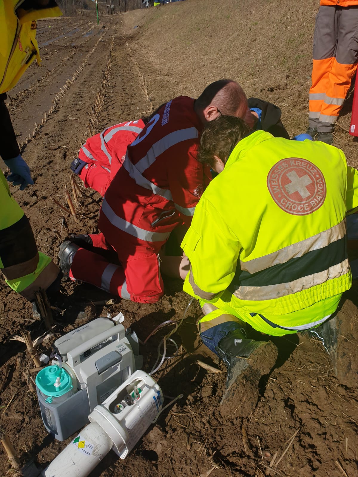 Abflug des Hubschraubers des AIUT ALPIN DOLOMITES – heli mountain rescue beim heutigen Verkehrsunfall.