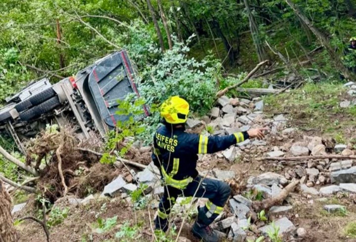 Una tarda mattinata di tensione quella vissuta ieri in via Breitenberg, sotto la Croce di Laives, luogo in cui un autocarro carico di pietre è uscito di strada precipitando per diverse decine di metri lungo una scarpata, in un terreno particolarmente impervio.