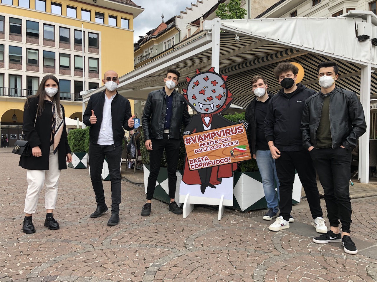 La sagoma del Vampvirus, in orario di aperitivo, è apparsa ieri a Bolzano prima in piazza Walther e poi in piazza Domenicani, spaventando simbolicamente i cittadini e chiudendo i bar. L’iniziativa, che ieri nel capoluogo ha riscontrato grande successo con numerosi giovani, cittadini e ristoratori che si sono avvicinati per fare un selfie, continuerà in tutta la regione fino a coprifuoco abolito. Per i ragazzi di GN il coprifuoco va semplicemente eliminato, senza se e senza ma.