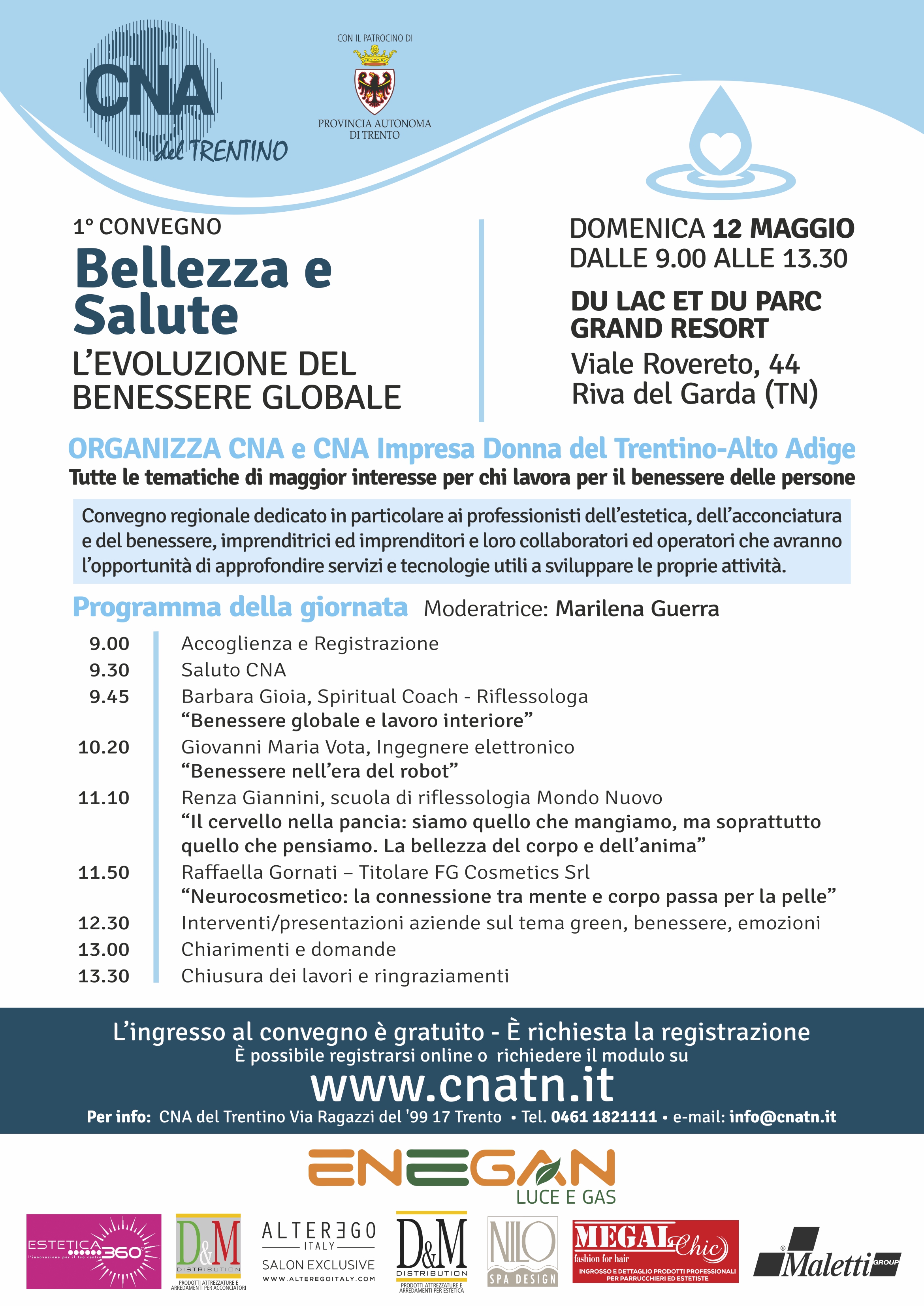 È tutto pronto per l’evento “Bellezza e Salute – L’evoluzione del benessere globale”, il convegno regionale organizzato da CNA e CNA Impresa Donna del Trentino Alto Adige, in programma domenica 12 maggio, dalle ore 9 alle 13.30, al Du Lac et Du Parc Grand Resort di Riva del Garda.