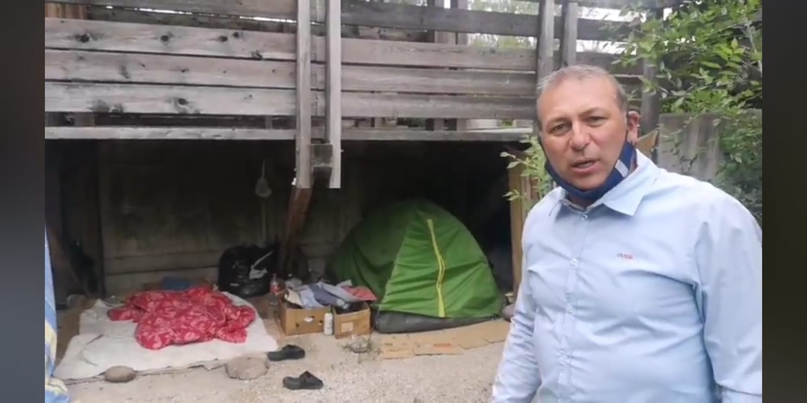 Dalle immagini del breve video si possono notare con chiarezza una tenda, un materasso con alcune coperte, immondizie e oggetti vari.