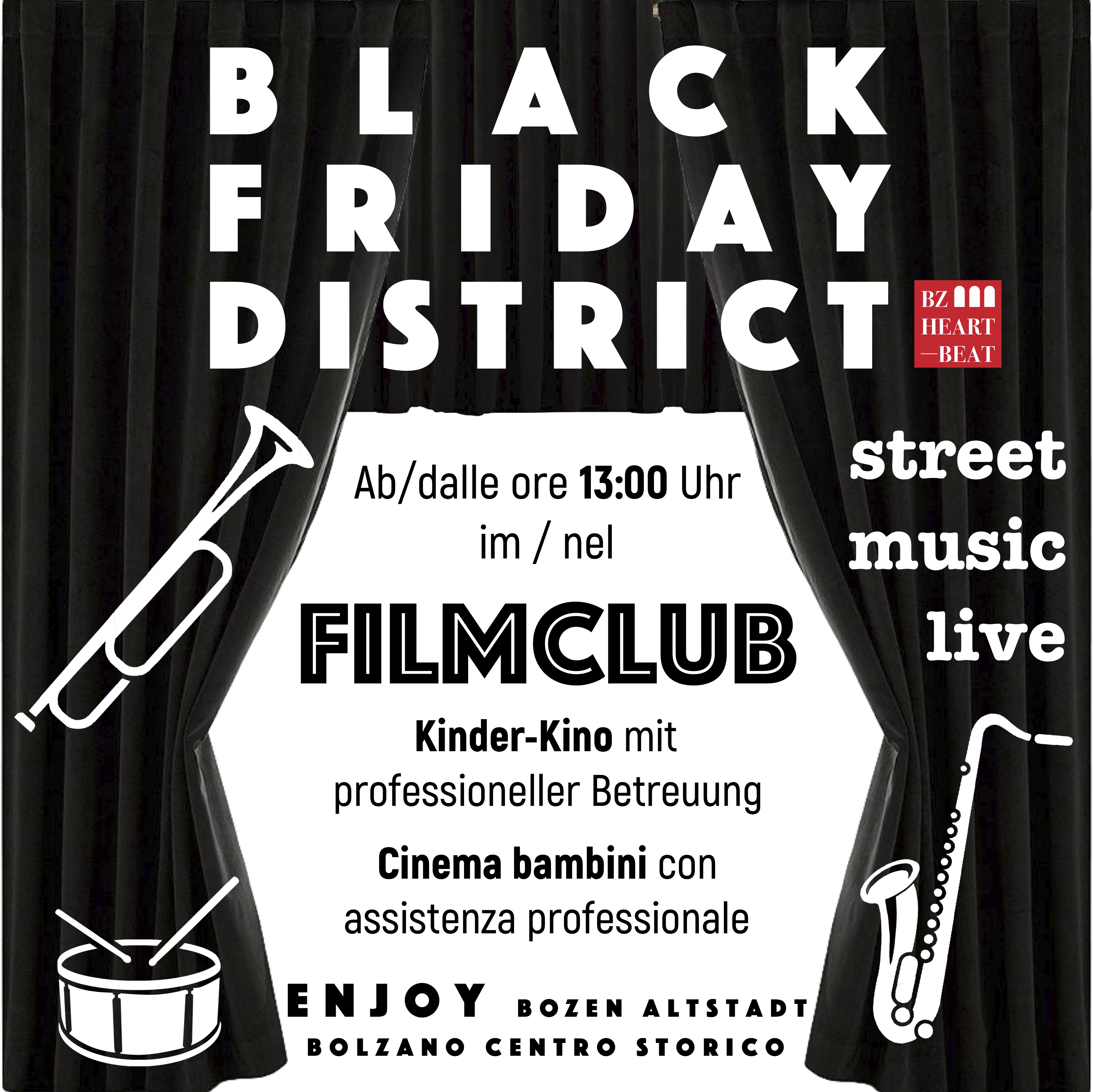 Così anche in Alto Adige: durante questa giornata molti vanno alla ricerca di un’occasione speciale. Altri ne approfittano per acquistare i primi regali natalizi. Per questo motivo, a Bolzano, BZ Heartbeat, insieme ai suoi soci, ha progettato un particolare contorno per questa giornata di shopping.