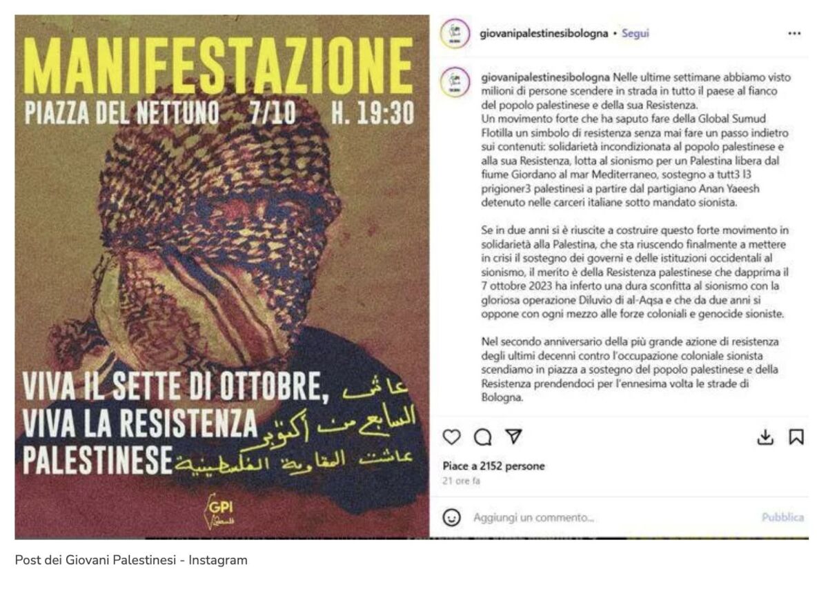 Il collettivo “Giovani Palestinesi Italia”, attivo in diverse città come Bologna, Milano, Torino e Roma, è molto presente sui social network, in particolare su Instagram, dove l’account nazionale conta oltre 155mila follower. Le loro piattaforme digitali si configurano come veicoli di propaganda antisionista, con contenuti che normalizzano e giustificano la violenza come strumento di “resistenza”.
