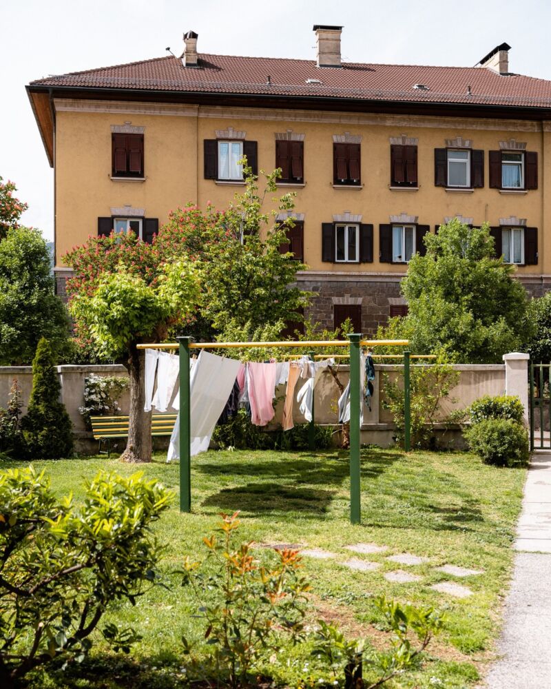“Una come tante” è un’installazione che documenta il viaggio alla scoperta di questi caseggiati. Durante la serata il grande stenditoio del giardino di via Piani 5 si trasformerà in un dispositivo per allestire un racconto visivo della giornata: su un fronte delle grandi fotografie restituiranno la ferma serialità degli edifici di Mazzoni, dall’altro lato si nasconderà un piccolo salotto en plain air dove il racconto del viaggio prenderà vita e sarà scandito dal rumoroso scorrere delle diapositive e dalle narrazioni dei partecipanti.