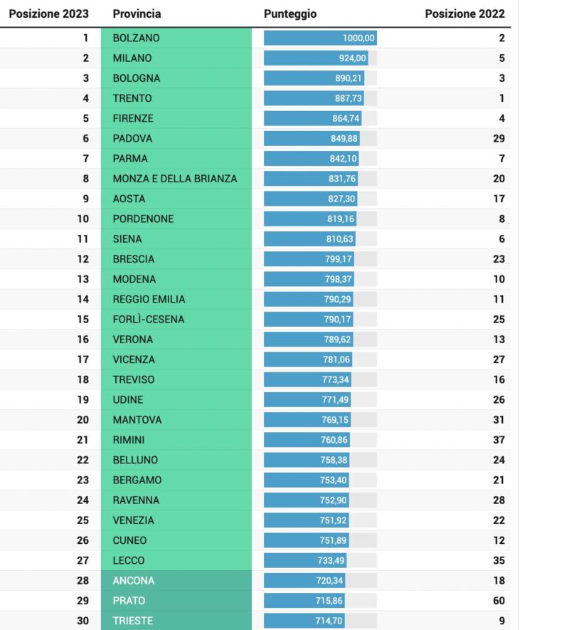 Seguono immediatamente Milano e Bologna, rispettivamente al secondo e terzo posto, confermando e migliorando le loro prestazioni rispetto al 2022, quando erano rispettivamente quinta e terza su 107. Trento e Firenze completano i primi cinque posti. Questi dati emergono dall’Indagine sulla qualità della vita condotta da ItaliaOggi – Ital Communications, in collaborazione con l’Università La Sapienza di Roma, giunta alla sua venticinquesima edizione.