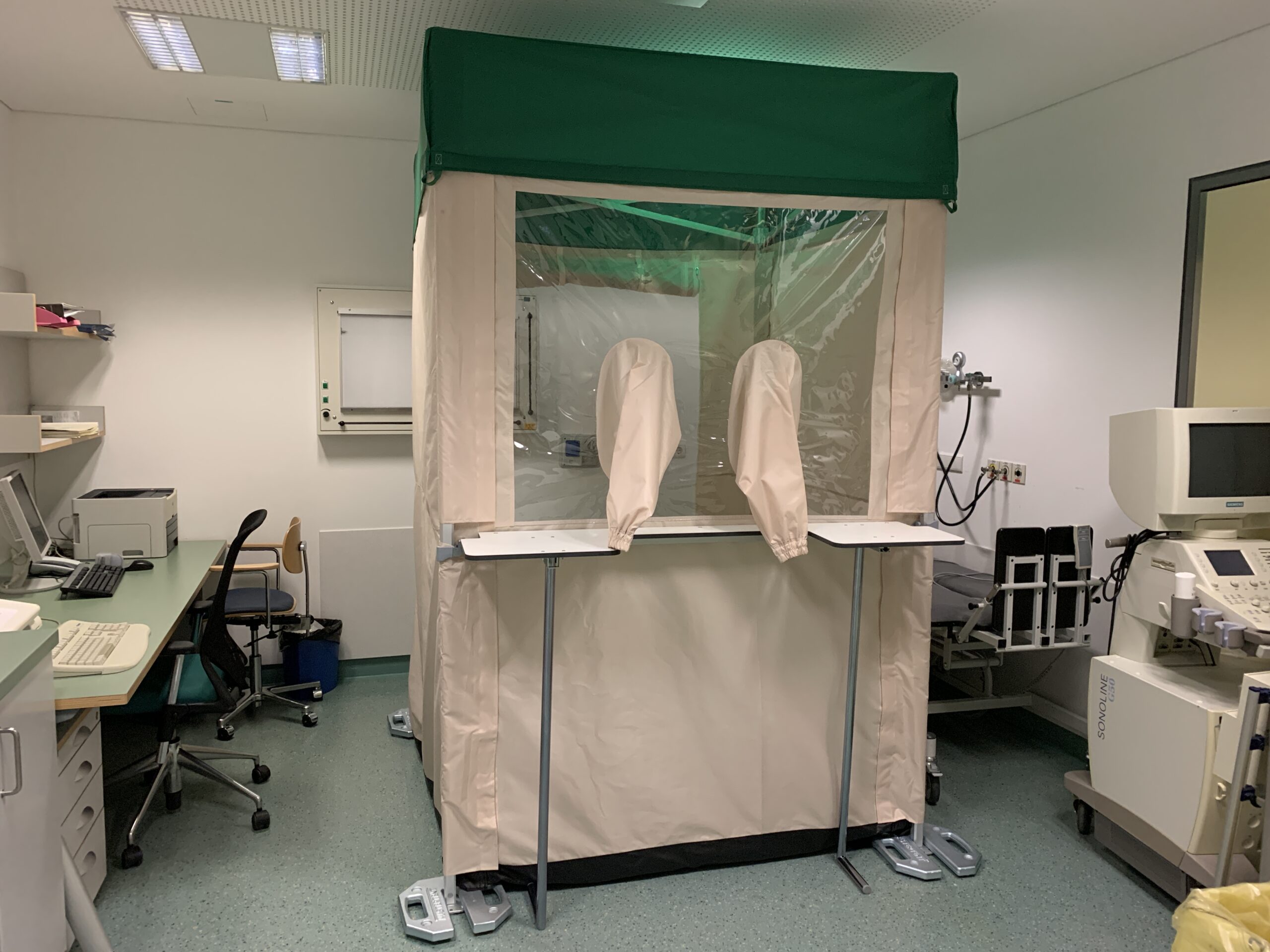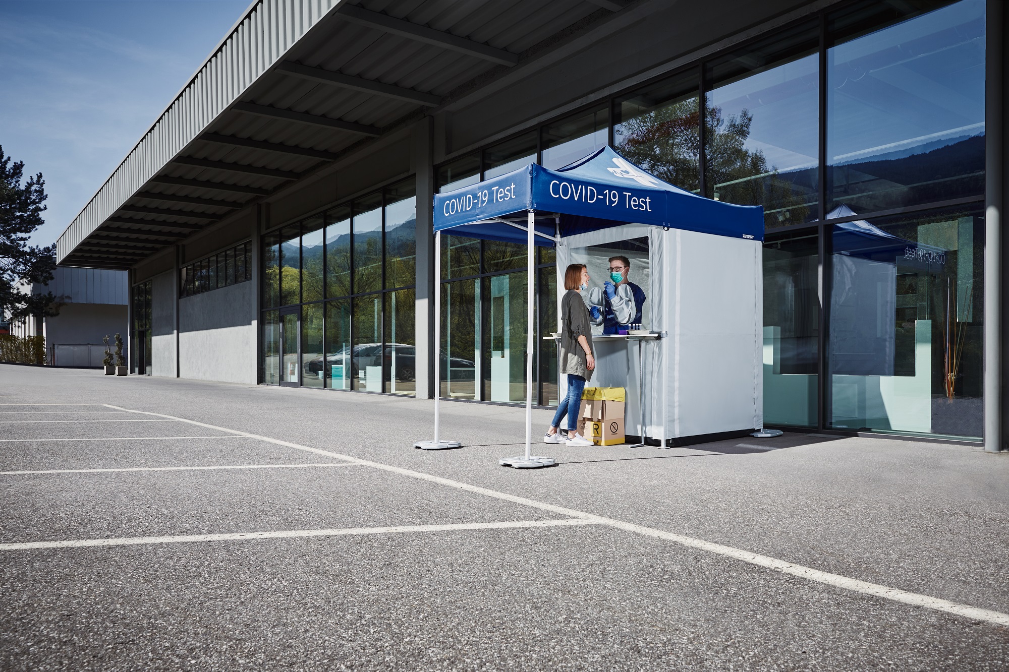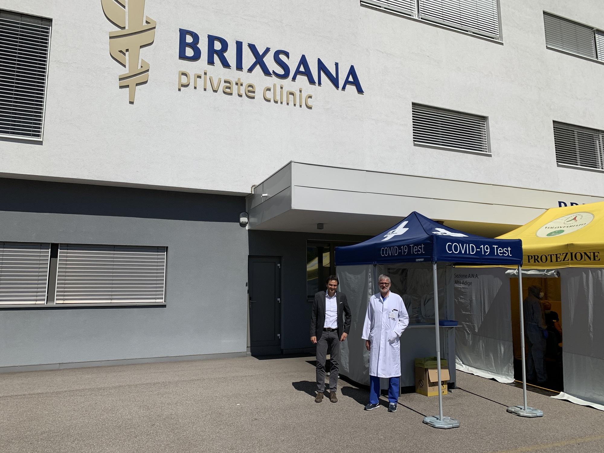 La cabina per test di Mastertent è in uso nella clinica privata Brixsana di Bressanone dal 22 aprile dove le persone vengono testate per il COVID-19 ogni giorno.