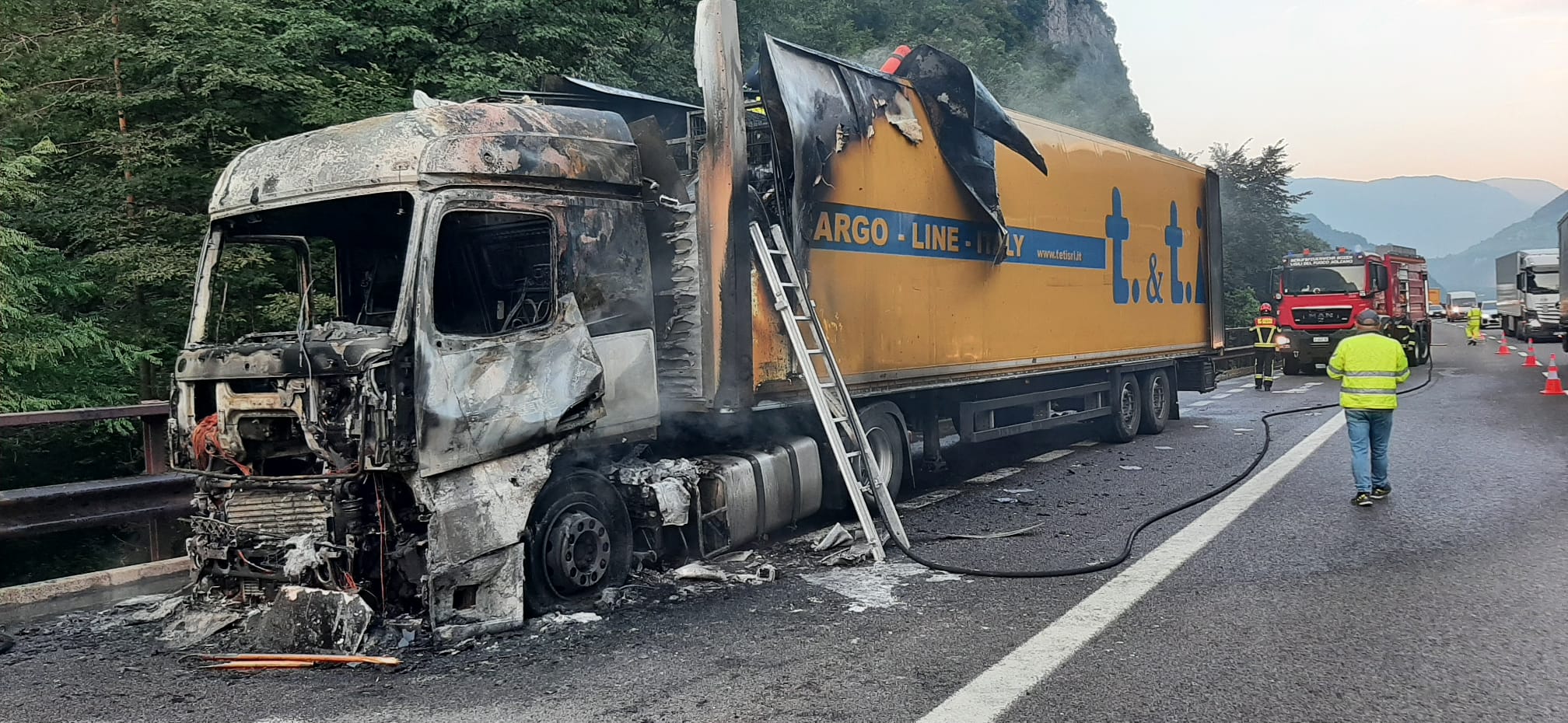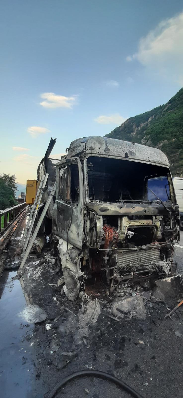 Camion si incendia in autostrada sulla corsia nord tra Bolzano Nord e Chiusa. All’arrivo dei vigili del fuoco di Chiusa e Cardano il mezzo era già completamente in fiamme.