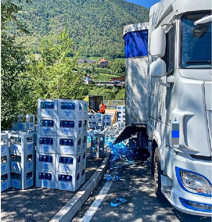 Nella giornata di ieri, 9 agosto, la strada alla rotonda sul ponte di Marlengo è stata completamente sommersa da pezzi di vetro rotti, dopo che un camion ha perso il suo carico di bottiglie di acqua.