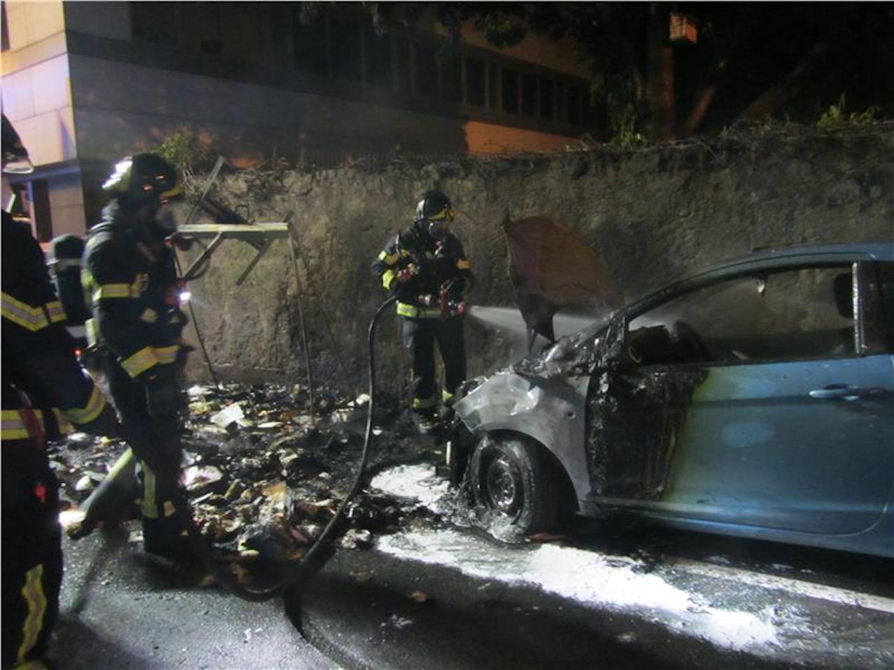 Campana della carta in fiamme in via Mendola distrugge un’auto e incendia un albero