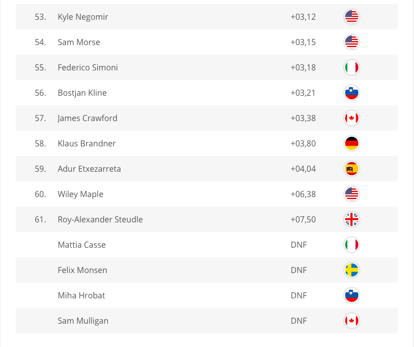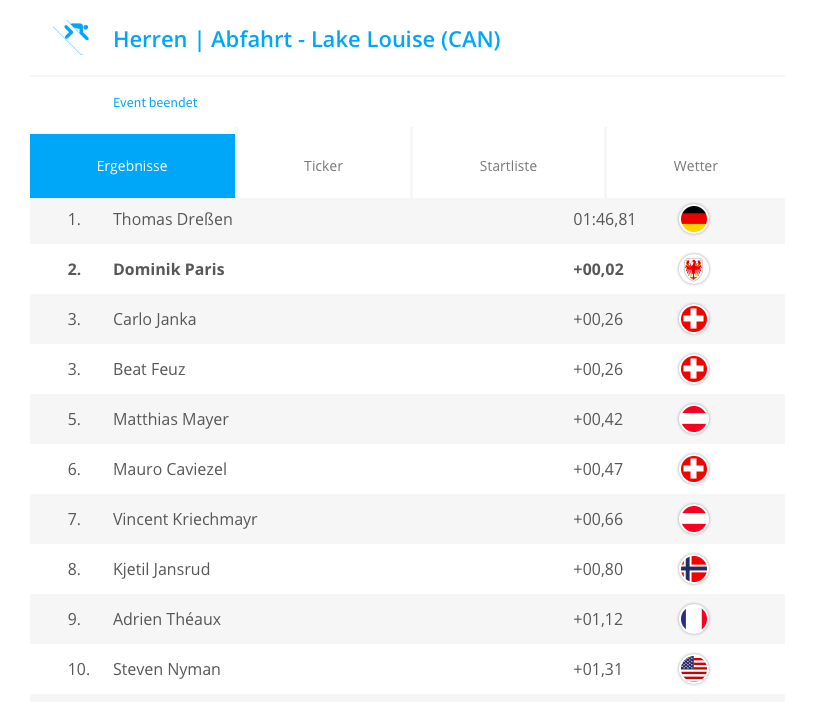 Nel seguire le gare della nazionale italiana e nello specifico quelle degli atleti italiani appartenenti al gruppo sportivo dell’Arma dei Carabinieri nelle graduatorie parziali così come pure in quella finale si nota, come riportato sulla pagina web dell’organo d’informazione locale altoatesino sportnews.bz, l’attribuzione agli atleti Dominic Paris e Peter Fill, entrambi militari dell’Arma, una bandiera non corrispondente a quella della nazione di appartenenza, ovvero l’Italia.