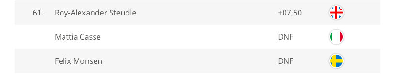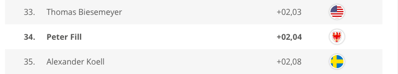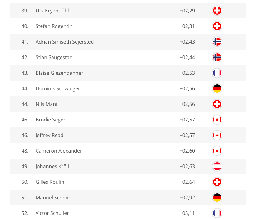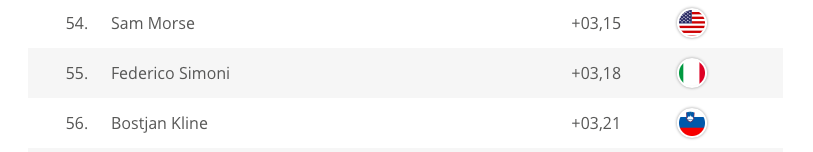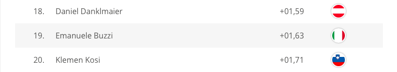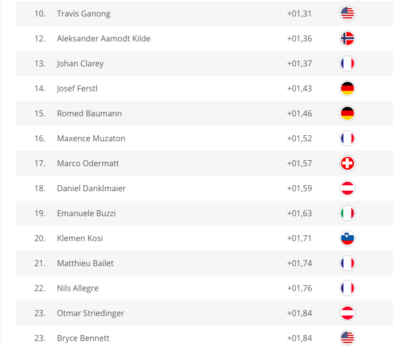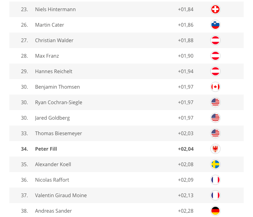 Sotto, la riproduzione così come riportata dal portale sportnews.bz, della classifica parziale (a titolo esemplificativo) del 30 novembre 2019. La gara è quella della prima discesa libera maschile.