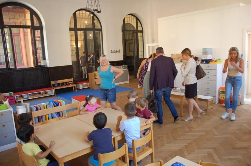 Pertanto dal 9 gennaio scorso tre sezioni di scuola materna hanno potuto riprendere le lezioni nella struttura rinnovata. Sono continuate invece le lavorazioni di finitura nella parte di ampliamento, atelier e alcune zone esterne che hanno visto il completamento a luglio 2023. Sono attualmente in corso le attività di fornitura degli arredi di serie e su misura ed è stata completata la fornitura della cucina di produzione.