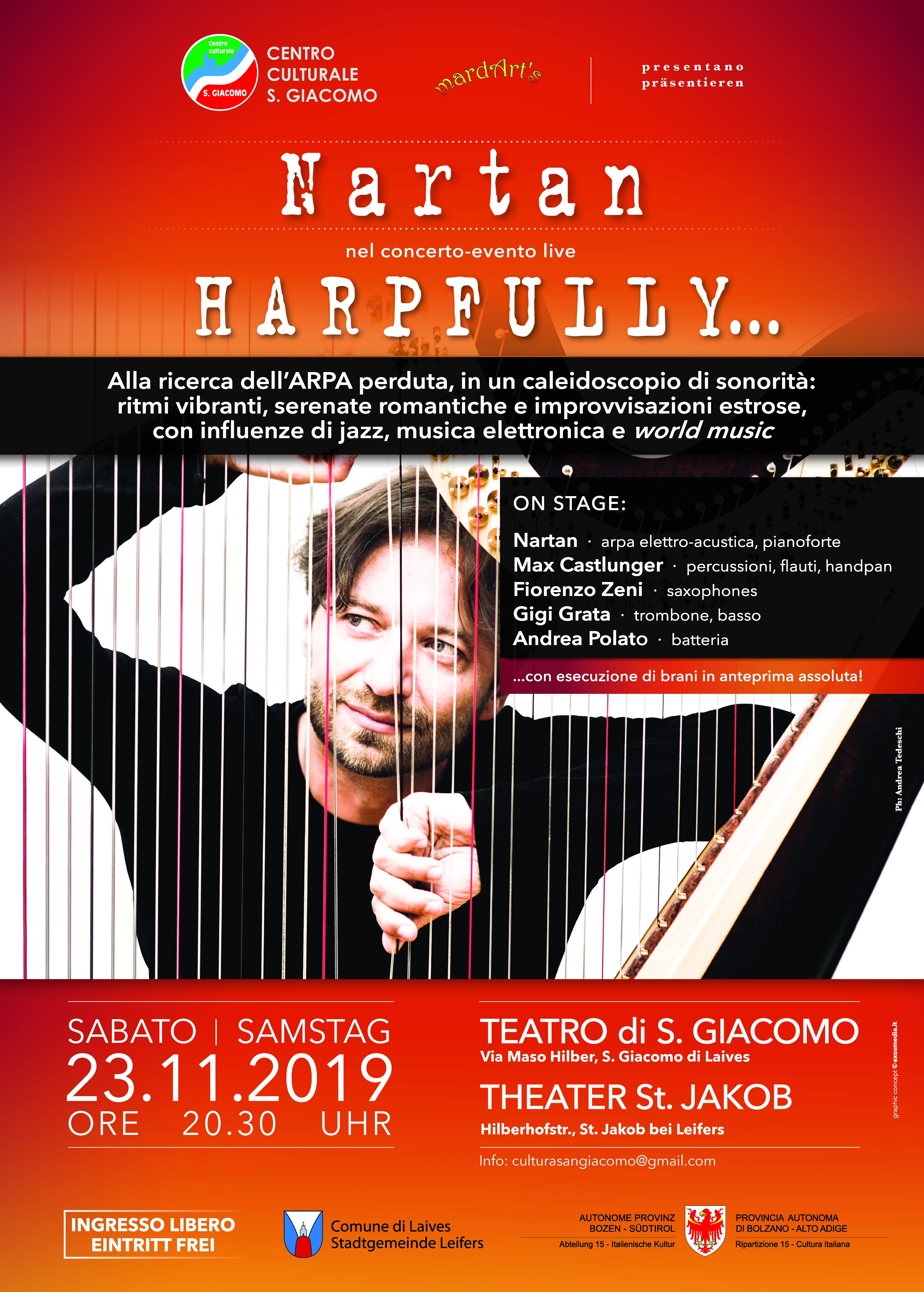 Questi i presupposti, gli ingredienti e l’obiettivo dell’intrigante progetto musicale firmato da NARTAN – arpista, pianista e compositore raffinato quanto fantasioso, nato a Milano ma altoatesino d’adozione, figlio d’arte – progetto che sabato 23 novembre, con inizio alle 20.30 e ingresso libero, lo vedrà protagonista sul palco del Nuovo Teatro di S. Giacomo assiema a quattro colleghi di pari caratura, tutti fiori all’occhiello della scena artistica provinciale.