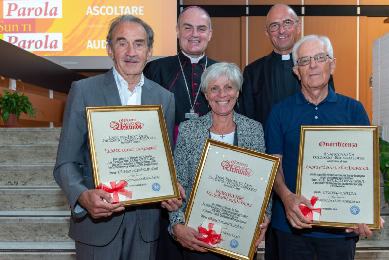 Oggi la cerimonia si è aperta con la laudatio pronunciata dal vicario generale Eugen Runggaldier, mentre il vescovo Ivo Muser ha consegnato medaglia d’onore e pergamena alle tre persone insignite: sono Flavio Debertol, sacerdote a Bolzano, Rosmarie Rassler Karbon di Siusi allo Sciliar e Hartwig Seifert di Bolzano.