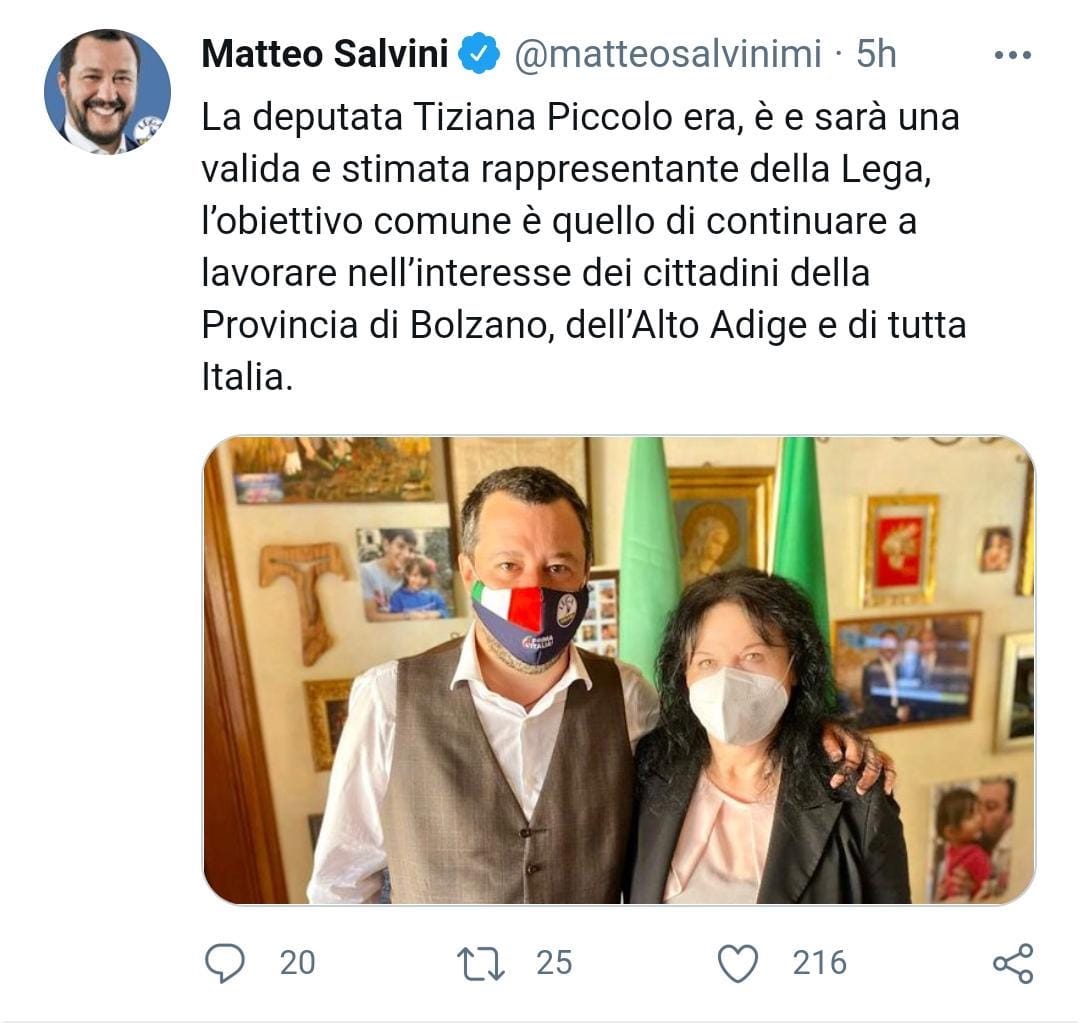 Così il leader Matteo Salvini in un post pubblicato su Facebook nella giornata di oggi: “La deputata Tiziana Piccolo era, è e sarà una valida e stimata rappresentante della Lega, l’obiettivo comune è quello di continuare a lavorare nell’interesse dei cittadini della Provincia di Bolzano, dell’Alto Adige e di tutta Italia“.
